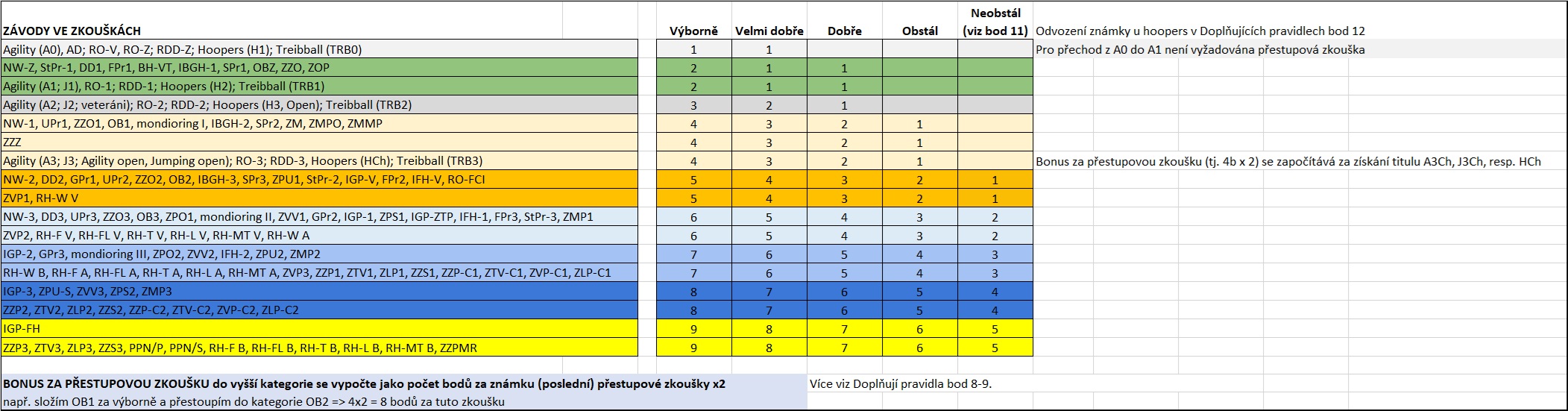 b) kynologické zkoušky (NW, BH-VT apod.), které jsou hodnoceny jen uspěl/neuspěl si započítají body za známku VÝBORNĚ x2